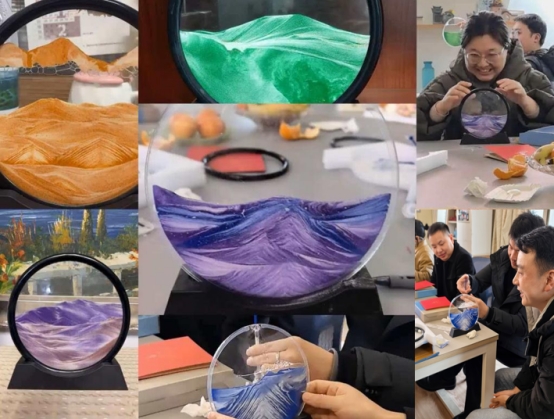 最受期待的流沙画DIY环节紧随其后。老师们兴致盎然,纷纷挑选心仪的流沙色彩组合,小心翼翼地铺沙、塑形、封框。有的老师创作了层次分明的山水图景,有的搭配出梦幻绚丽的渐变色彩。制作过程中,大家相互交流技巧、分享创意,不时传来欢声笑语。原本普通的细沙,在老师们的巧手下变成了一幅幅独一无二的流沙画作品,每一幅都承载着对生活的热爱与对未来的憧憬。