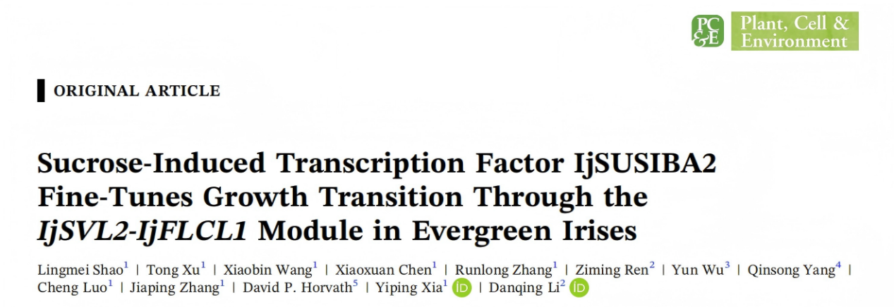 球宿根花卉创新团队的李丹青老师,任梓铭老师联合浙江大学园林研究所,在国际著名期刊Plant, Cell & Environment发表了题为“Sucrose-Induced Transcription Factor IjSUSIBA2 Fine-Tunes Growth Transition Through the IjSVL2-IjFLCL1Module in Evergreen Irises”的研究论文,揭示了糖信号转录因子IjSUSIBA2通过调控IjSVL2-IjFLCL1模块,影响淀粉代谢途径,从而调控常绿鸢尾蝴蝶花(Iris japinica)冬季生长转换的作用机制,为多年生植物的栽培与育种改良提供了新思路。