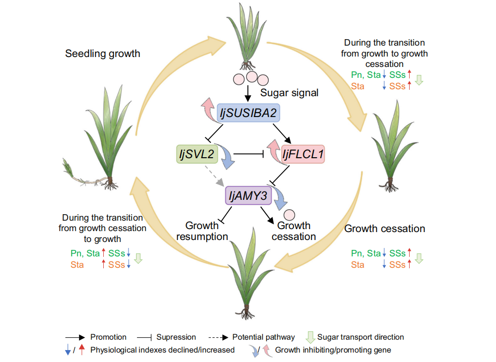 通过转录组分析,研究团队鉴定出多个与生长转换密切相关的MADS-box转录因子。同源瞬时基因功能验证表明,IjFLCL1在促进生长恢复中发挥核心作用,而其下游基因IjAMY3则通过调控淀粉降解从而抑制生长。同时,受糖信号诱导的转录因子IjSUSIBA2被证实能直接促进IjFLCL1,并抑制IjSVL2的表达,从而形成一个新的调控通路:IjSUSIBA2-IjSVL2-IjFLCL1-IjAMY3(图2)。