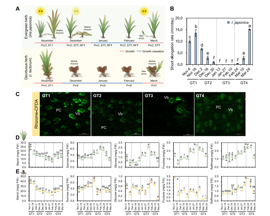 研究表明,蝴蝶花在冬季虽停止可见生长,但仍保持活跃的代谢活动,不仅能够持续进行光合作用,叶片合成的碳水化合物还不断向根状茎转运,同时伴随着淀粉的逐步消耗和可溶性糖的累积,表现出不同于典型休眠植物的能量与物质调控模式(图1)。