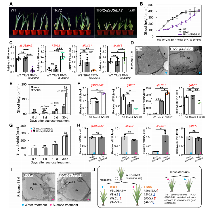 通过转录组分析,研究团队鉴定出多个与生长转换密切相关的MADS-box转录因子。同源瞬时基因功能验证表明,IjFLCL1在促进生长恢复中发挥核心作用,而其下游基因IjAMY3则通过调控淀粉降解从而抑制生长。同时,受糖信号诱导的转录因子IjSUSIBA2被证实能直接促进IjFLCL1,并抑制IjSVL2的表达,从而形成一个新的调控通路:IjSUSIBA2-IjSVL2-IjFLCL1-IjAMY3(图2)。