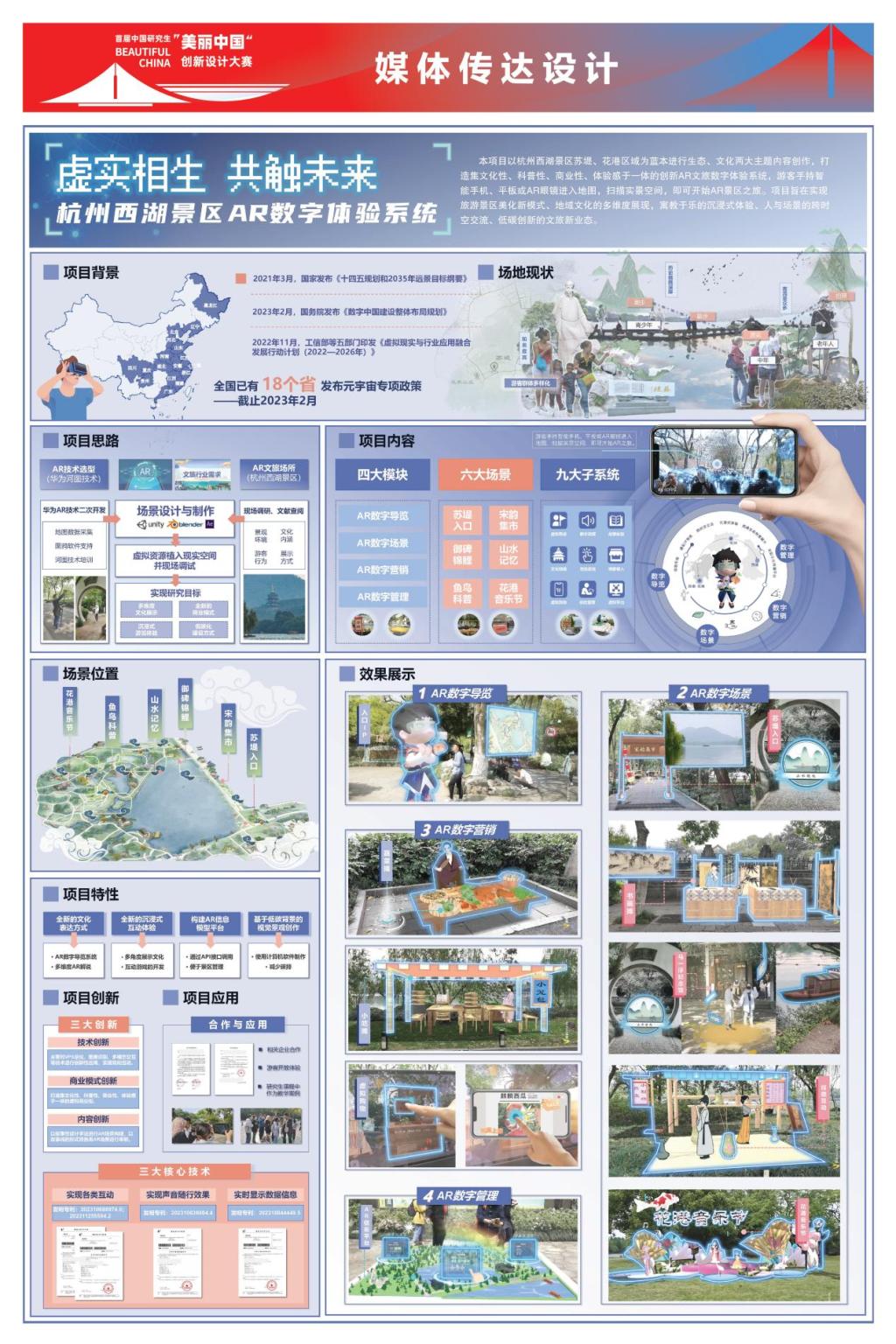 11月26日,由教育部学位管理与研究生教育司指导、中国学位与研究生教育学会和中国科协青少年科技中心主办的首届中国研究生“美丽中国”创新设计大赛在杭州建德落下帷幕。首届中国研究生“美丽中国”创新设计大赛于2023年6月12日正式启动,设置有环境空间设计、服装与服饰设计、工业产品设计、媒体传达计、建德主题设计五个不同赛道。大赛赛程历时6个多月,来自全国304所高校和科研院所的5943支团队、15559名研究生踊跃与,参赛规模居中国研究生创新实践系列大赛16项主题赛事前三。此次大赛共有284份作品进入等级奖名单,抖阴 麻欣瑶胡广老师指导的研究生项目《虚实相生,共触未来一一杭州西湖景区 AR 数字体验系统》荣获全国三等奖,这也是学院“红筑未来”AR工作室的成果。