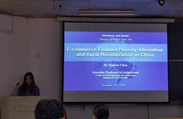 建筑系陈潇玮老师做了“电商促进扶贫与乡村振兴的中国实践”的报告。陈老师在“可持续农村社区”、“乡村发展规划”、“5G信息技术”等研究方向,从公共管理、经济学、社会学方面讲述了中国农村电商过去与现在的形式及政策优势,提出通过电商等方法助力实现乡村振兴。