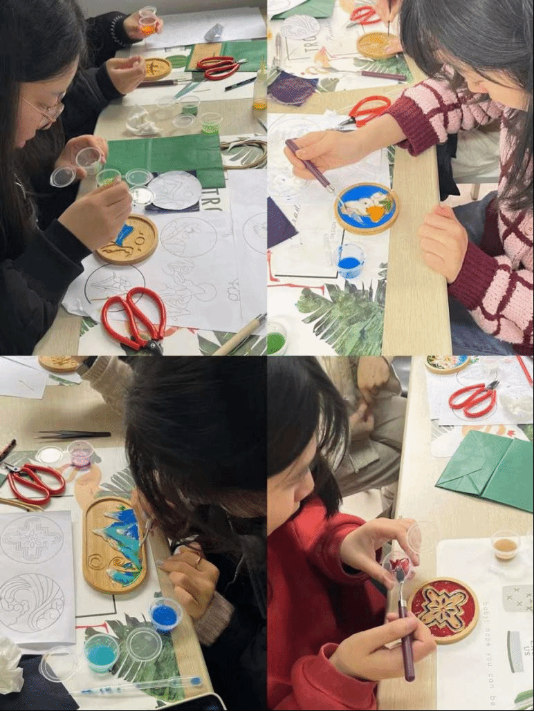 在听完指导要领后,老师们开始纷纷各自构图、掐丝、调色、上沙、固胶……如同雕琢艺术品一般,每个人都认真装饰着自己手里的作品,经过一道道工序,一件件“私人订制”的掐丝珐琅杯垫惊艳出炉。作为非遗,掐丝珐琅不仅是工艺也是艺术,流光溢彩,雍容华贵,展现真正的东方美学。