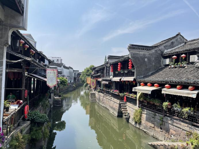 早上,在一路欢声笑语中,一行到达新市古镇景区。古镇有数千年历史,砖雕门楼,飞檐翘角,临河而建,傍桥而市,有着典型的江南风情。相较于其他古镇的繁华、熙攘,新市古镇显得更加娴静、明朗。大家三两成行,沿河观赏,不时驻足拍照留影,享受这难得的清闲。