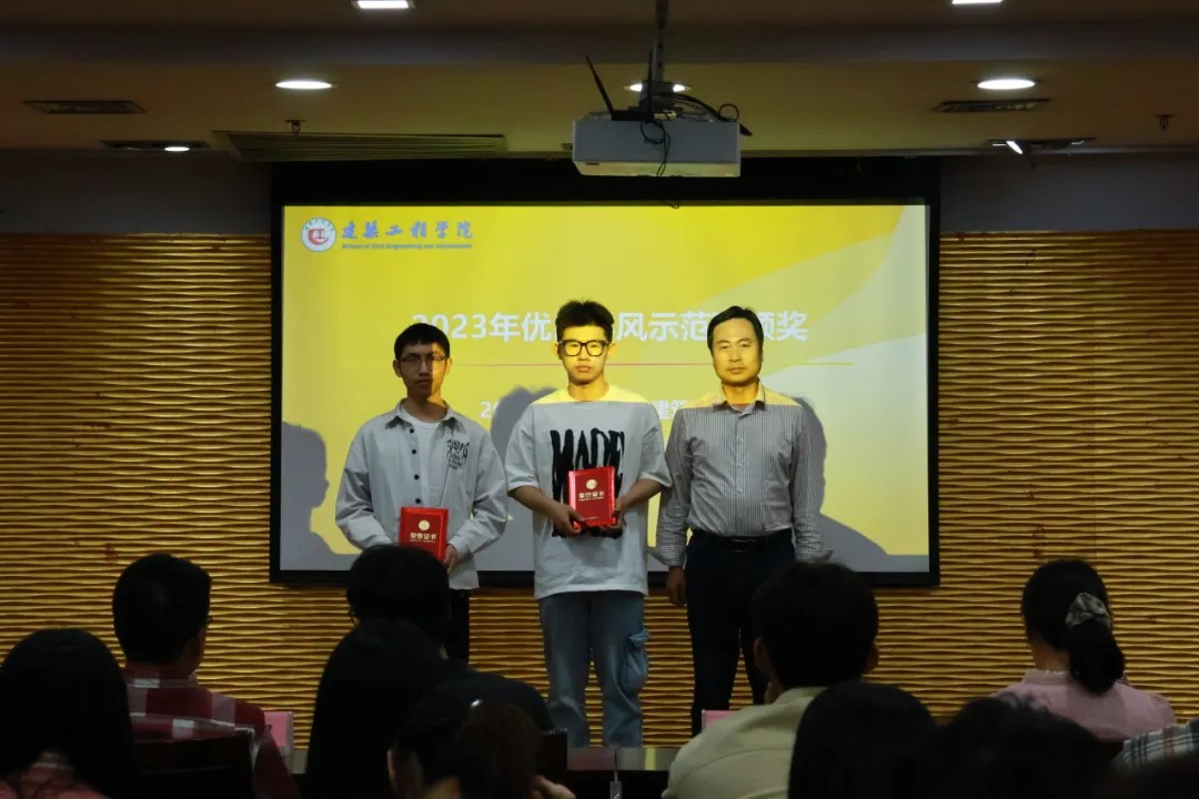 李浪浪、吕超、王欢欢和杨博依次为建环新生奖学金获奖学生、2023-2024学年优良学风寝室以及2023学年优良学风示范班获奖学生代表颁奖,同时对过去一年学风建设中的先进典型进行表彰。