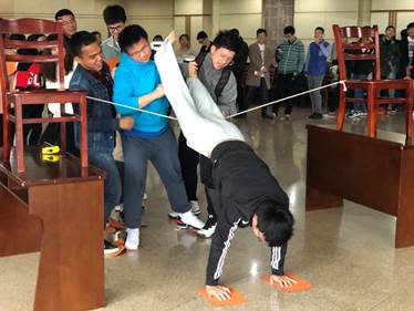 由“我”构“我们”,由“我”壮“我们”。过硫酸河的游戏正是凭借它对学员间协作能力和团队凝聚力的高要求性把整堂课带入高潮。长路单薄纸,拧众人一心,高矮电网硫酸河,引群策群力。学员们在过程中感受由个体融入到一个集体,由小“我”变为大“我们”的充实感,同时学习与人相识的艺术,和要善于倾听长于思考的处世哲学。