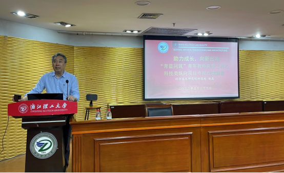 5月23日下午,建筑工程学院在行政楼一楼报告厅举行“青蓝同筑”青年教师筑梦工程第四期——科技纵向项目申报政策解读交流会,助力教师成长,向新目标出发。学院特邀学校科学技术研究院科学技术处高新技术科科长赵磊来作辅导交流,会议由杨杨院长主持。