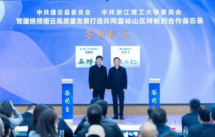与缙云县人民政府共建缙云研究院签约仪式暨丽缙高新区成立十周年工作大会在缙云县丽缙高新区举行。校党委书记吴锋民,缙云县委书记王正飞,缙云县委副书记、县长王益,校机关党委书记、组织部副部长任宁,科学技术研究院常务副院长、科技处处长、产业技术中心主任杨晓刚,党校办公室副主任卢跃华,学院党委书记李娜,执行院长俞峰,校技术转移有限公司副总经理、土木系教师闻敏杰,缙云研究院院长、建筑系教师郭青海等出席了签约仪式。