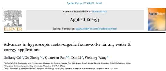 近日,我校郑旭教师团队在《Applied Energy》上发表了题为“Advances in hygroscopic metal-organic frameworks for air, water & energy applications”的综述论文,报道了近年来吸湿性金属有机框架材料(MOFs)在空气、水、能源领域的研究进展。本文第一作者是抖阴