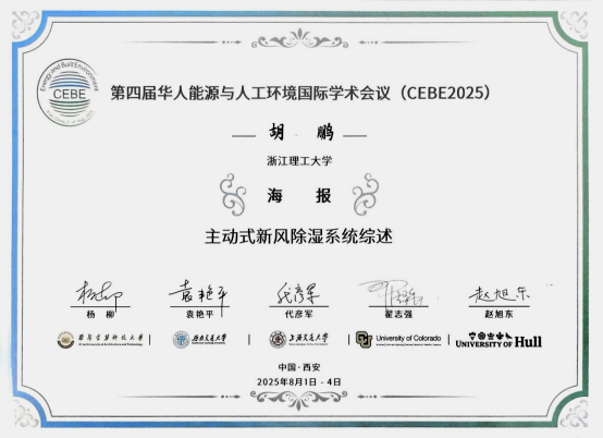建环系教师郑旭与研究生胡鹏一同参会,并分别在会议上作了学术展示。会议期间,郑旭老师在“建筑设备节能新技术”分会场作了题为《活性炭-聚合物复合涂层微通道与翅片管换热器的性能对比》的邀请报告,介绍了课题组在该方向的最新研究进展,引发了与会者的广泛关注与讨论。研究生胡鹏在海报展示环节展示了其在郑旭老师指导下完成的《主动式新风除湿系统综述》研究,与多所高校师生进行了深入交流,并获得积极反馈。
