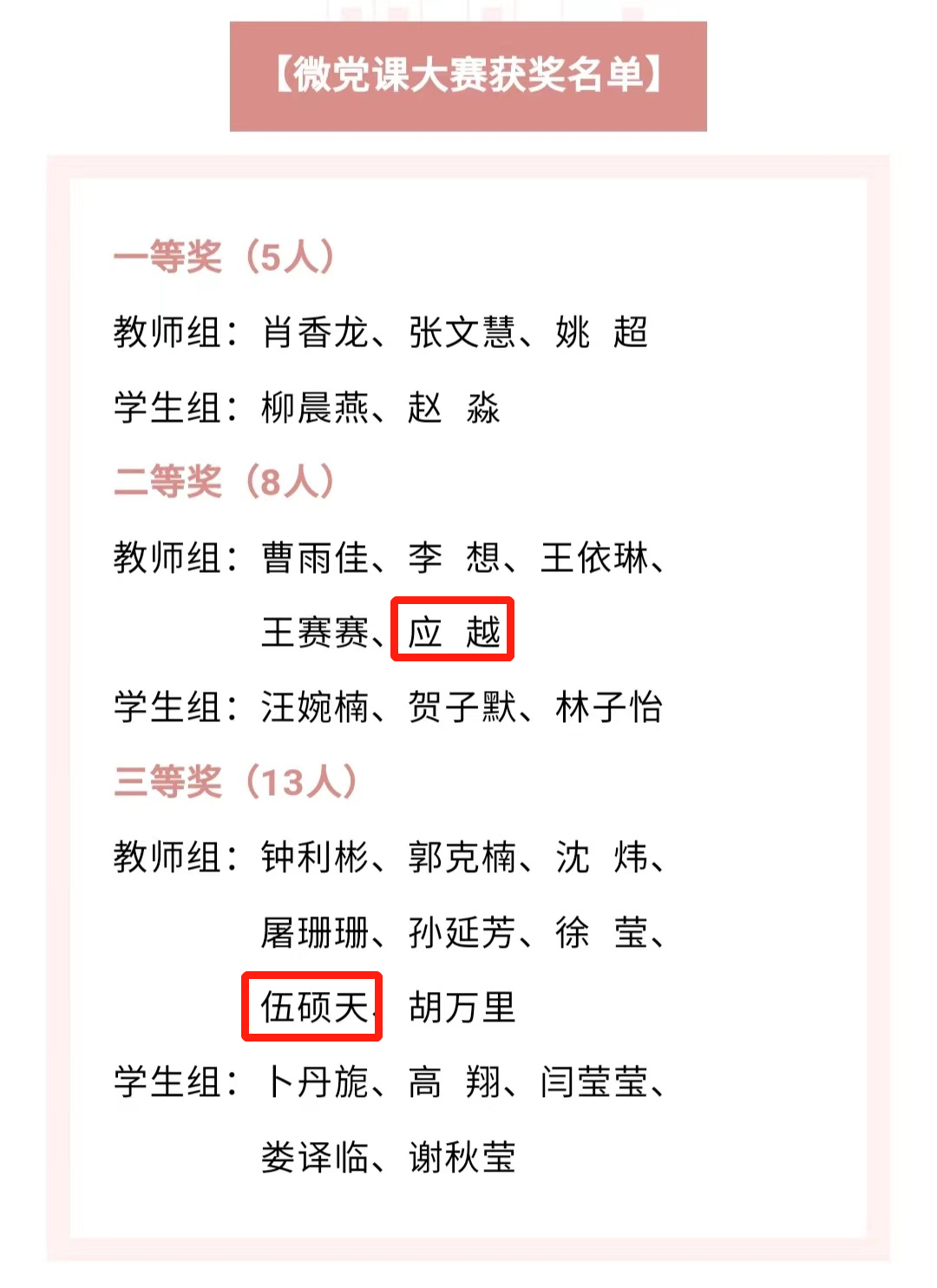 参赛教师在此次微型党课决赛中斩获佳绩,工程管理学生党支部书记应越获二等奖,建筑学第一学生支部书记支部书记伍硕天获三等奖。