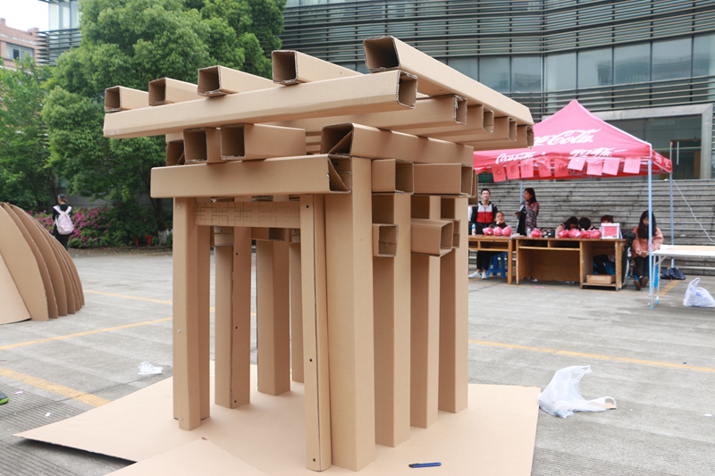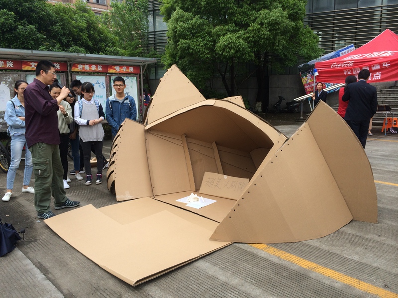 在入围决赛的8支团队中,无不展现出各自组的动手能力与团队精神,即使收到了天气条件的影响,但我们依然看到八组的大作成功展现。大赛制作的模型在今天的校内展出后,将会于5月在宝龙广场再次展出,让校外的居民群众感受到当代大学生的创意与浓厚的文化氛围。因纸板模型的简易拆搭,模型材料在展出后可拆卸,废物再利用,循环往复以致节能。