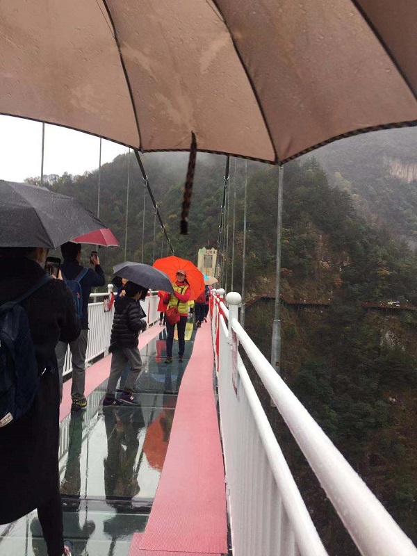 随后大家游览了新开放的太湖源5D悬空玻璃吊桥,挑战各位老师的胆量。太湖源5D悬空玻璃吊桥是华东地区最大的玻璃观景桥,桥面总跨度258米,宽度2.8米,距谷底高度185米,该桥气势恢宏,临空飞架南北,峡谷天堑变通途,与大自然为一体,堪称现代工程与自然风景完美相融。可切身体验立云端之际临万丈深渊惊心动魄的刺激感觉。