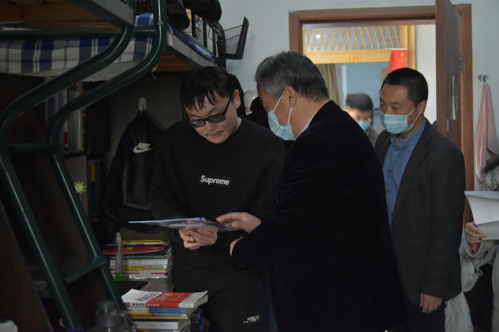 与此同时,为了进一步了解学生的学习和生活情况,学院党政班子成员以及辅导员们一同走访学生宿舍,细致地询问同学们的学习状态和生活近况,为学生送上口罩、消毒液等防疫物资,叮嘱大家疫情期间做好个人防护,表达了最温暖的问候。同时也提醒学生,期末考试在即,要劳逸结合,调整状态,科学备考,充分利用最后的时间,引导同学们以积极平和的心态应对考试,祝福同学们取得优异的成绩。
