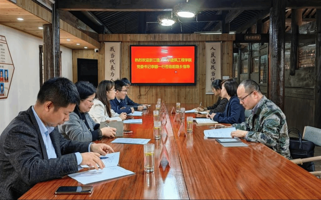 调研团一行首先来到党建共同体单位缙云县前路乡。乡党委书记胡文君、乡长巫海波感谢学院和缙云研究院对前路在红色文化传承、“茭麻共生”项目等方面的支持,介绍了前路乡中国重要农业文化遗产“茭白-麻鸭共生系统”和温泉项目等乡里重点工作的建设情况,希望学院发挥专业优势,在乡村规划、乡村文化、遗产保护等方面给予智力支持,促进前路的建设发展。
