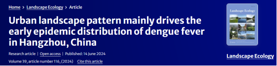 风景园林专硕研究生赵馨玉在Landscape Ecology上发表了题为“Urban landscape pattern mainly drives the early epidemic distribution of dengue fever in Hangzhou, China”的研究论文,分析了中国登革热新发疫区杭州的登革热疫情传播与城市景观空间格局之间的关系,提出了一种利用城市景观特征预测登革热空间风险的技术框架。本研究的发现凸显了景观流行病学在公共卫生管理和城市可持续发展中的关键作用。风景园林系胡广教授为该论文通讯作者。《Landscape Ecology》创刊于1987年,是国际景观生态学领域的旗舰杂志,主要探索有关景观生态学理论与方法、生态保护、土地管理、景观设计规划和景观作为耦合人环境系统的可持续性的基础和应用研究问题。2023年影响因子为5.2,中科院2区期刊。