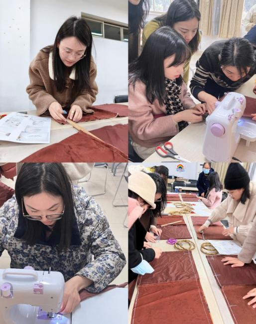 现场,老师们在听完制作步骤要领后,开始测量、画线、缝合、装手柄...看似简单,动起手来才知过程的繁复,深感手艺人的不易。有的老师坚持手工缝制,有的老师想体验缝纫机的乐趣,每个人都认真雕琢着自己手里的作品。经过一道道工序,最初简单的一块布摇身变成一个个精致的手提包,老师们纷纷感叹很有“成就感”。一件件手工作品既是对美的追求,也传递着老师们积极向上的生活态度。